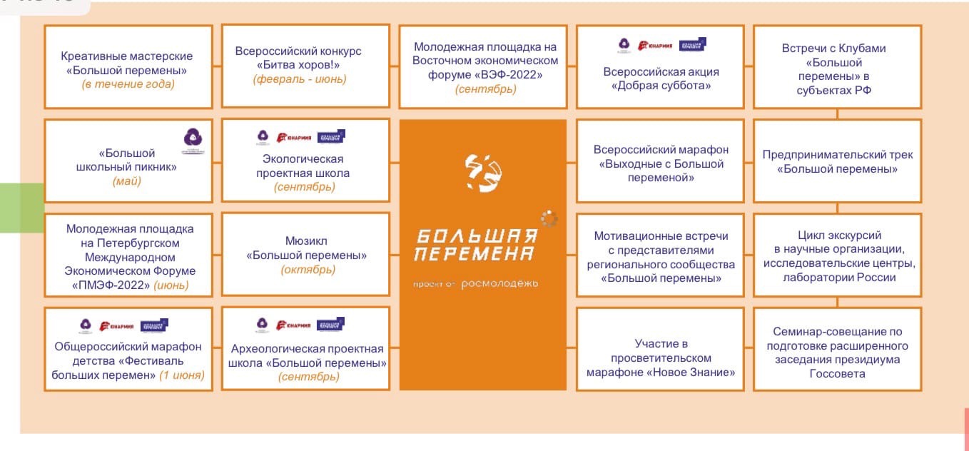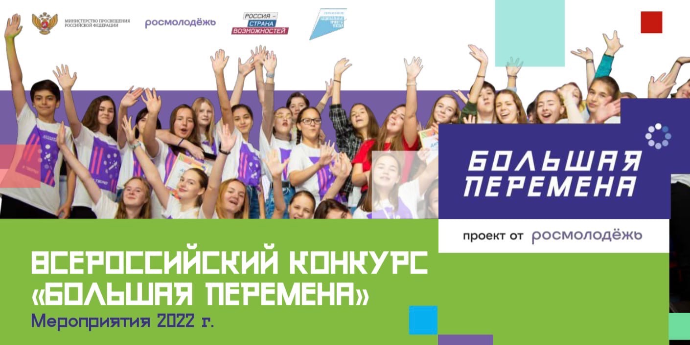 С 1 марта 2022 г. в Российской Федерации проходит Всероссийский конкурс "Большая перемена", реализуемый в рамках федерального проекта "Патриотическое воспитание граждан Российской Федерации" национального проекта "Образование".